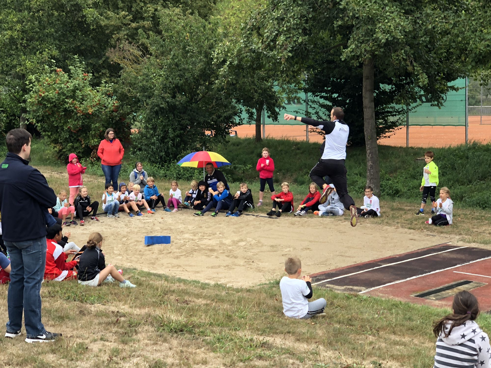 Zwischen den Stationen wurden die kleinen Pausen zum einen zur Stärkung genutzt, denn es gab Äpfel und Getränke für alle, zum anderen gab es aber auch etwas zum Staunen: Ex-Zehnkämpfer Rene Stauß zeigte, dass er den Wurfheuler ziemlich weit über den Sportplatz werfen kann und es gab auch eine kleine Weitsprungvorführung. Unter tosendem Beifall hatte der 30-jährige schnell zahlreiche Fans bei den Kindern gefunden.