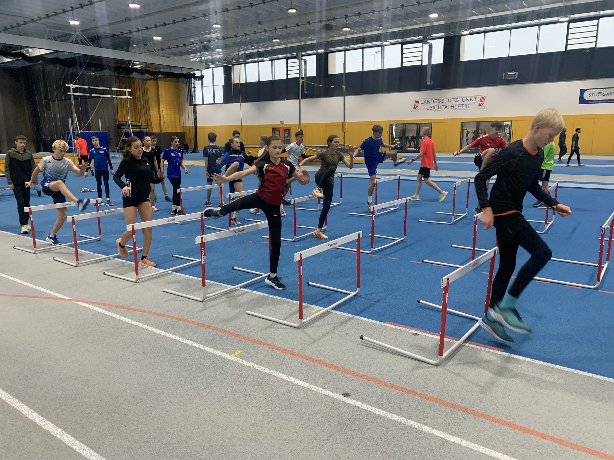 Den Abschluss des kurzweiligen Tageslehrgangs in Stuttgart bildete die zweite Trainingseinheit des Tages. Nach der Erwärmung mit Hürden wartete ein Kraftausdauerzirkel auf die Läufer:innen der Jahrgänge 2008 und 2009. Drei Druchgänge mit jeweils 12 Stationen hatten die Trainer um Christoph Thürkow dafür aufgebaut. 5 Steigerungen rundeten das Training am Nachmittag ab.