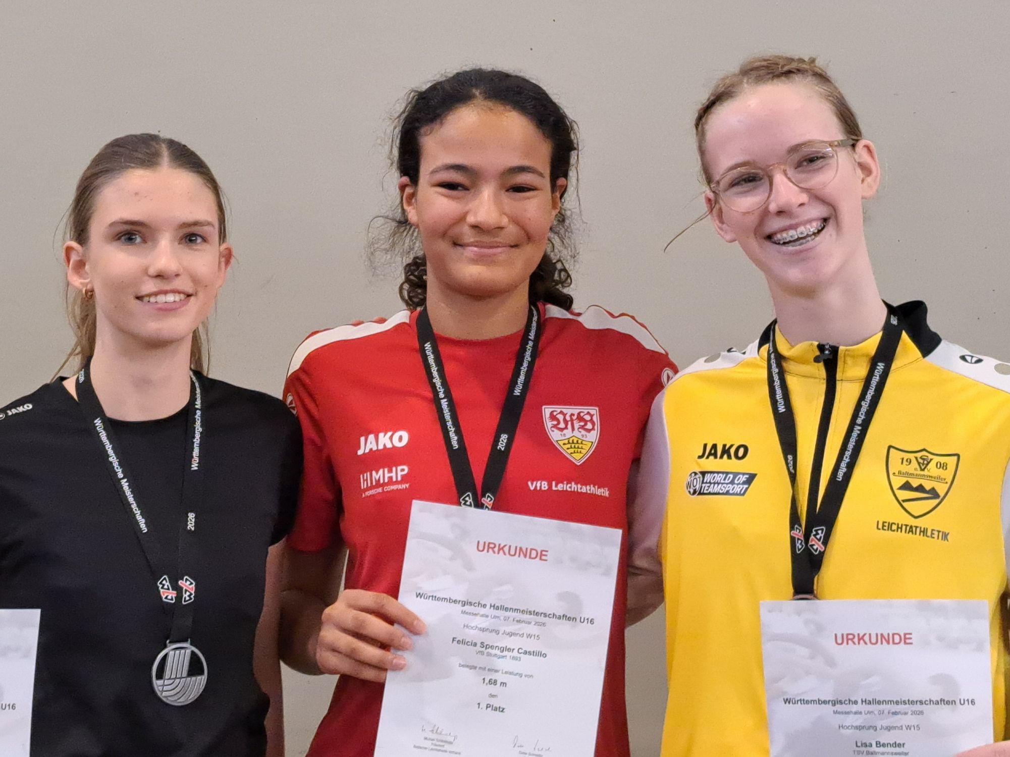 Mehr Gold gab’s in der W15 für Luna Drayton (SSV Ulm 1846). Ihr gelangen gleich drei Erfolge über 60 Meter in 8,02 und 60 Meter Hürden in 9,36 Sekunden sowie mit 5,43 Meter im Weitsprung. Am dichtesten war die Konkurrenz im Hochsprung, wo gleich sechs Athletinnen 1,62 Meter überquerten und am Ende Felicia Spengler Castillo (VfB Stuttgart) mit 1,68 Meter die Nase vorn hatte. Sehr stark auch die Siegerleistungen über 800 Meter, wo Aurelia Lehr (SpVgg Feuerbach) am Ende fast im Alleingang 2:16,61 Minuten erzielte, und die 12,64 Meter von Mehrkämpferin Lisa Bender (TSV Baltmannsweiler) im Kugelstoßen.